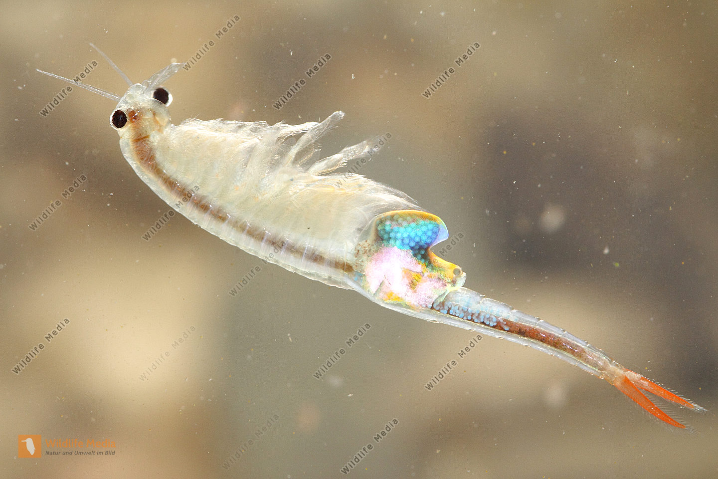 Se trata de ejemplares de pequeño tamaño, de cuerpo translúcido con reflejos azulados dorsales, nadando en un charco pluvial.